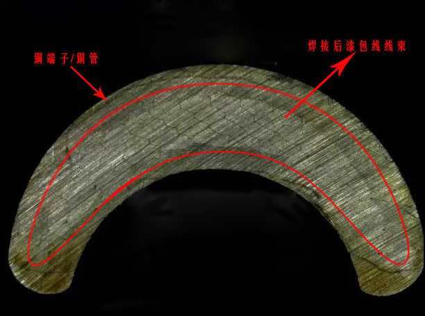 熱熔焊接工藝是首先對漆皮進行氣化(省去刮漆皮工序),通過相鄰金屬表面熔接,形成金屬分子層之間的熔合,幾乎將相鄰金屬熔接為一個整體,相比端子壓接后相鄰銅線仍為獨立金屬個體而言,熱熔接部位的密實度更好,幾乎不會出現(xiàn)空洞(如圖示1)。導電性好,電阻系數(shù)極低或近乎零,有效提高了電機的使用耐久性,不易發(fā)熱,無質(zhì)量隱患。